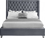 Introducing the Bed Grey-IF 5890, where contemporary edge meets timeless elegance. This striking wing bed combines the cozy embrace of a classic silhouette with the sleek brilliance of modern chrome accents. Featuring deep button tufting, gleaming nailhead details, and slender chrome legs—all wrapped in rich grey velvet—this bed creates a captivating focal point of plush luxury and refined style, designed for a truly sophisticated retreat.